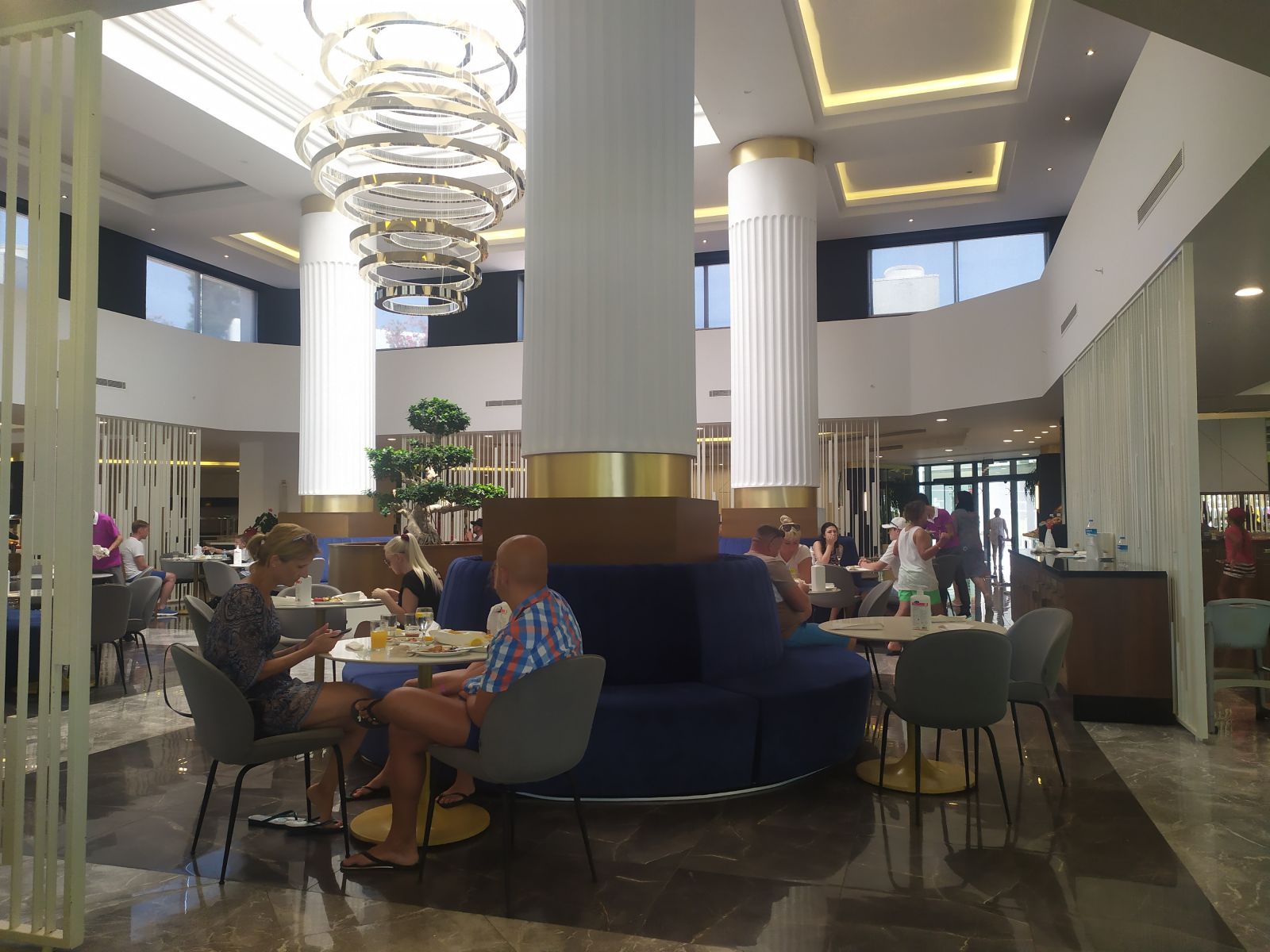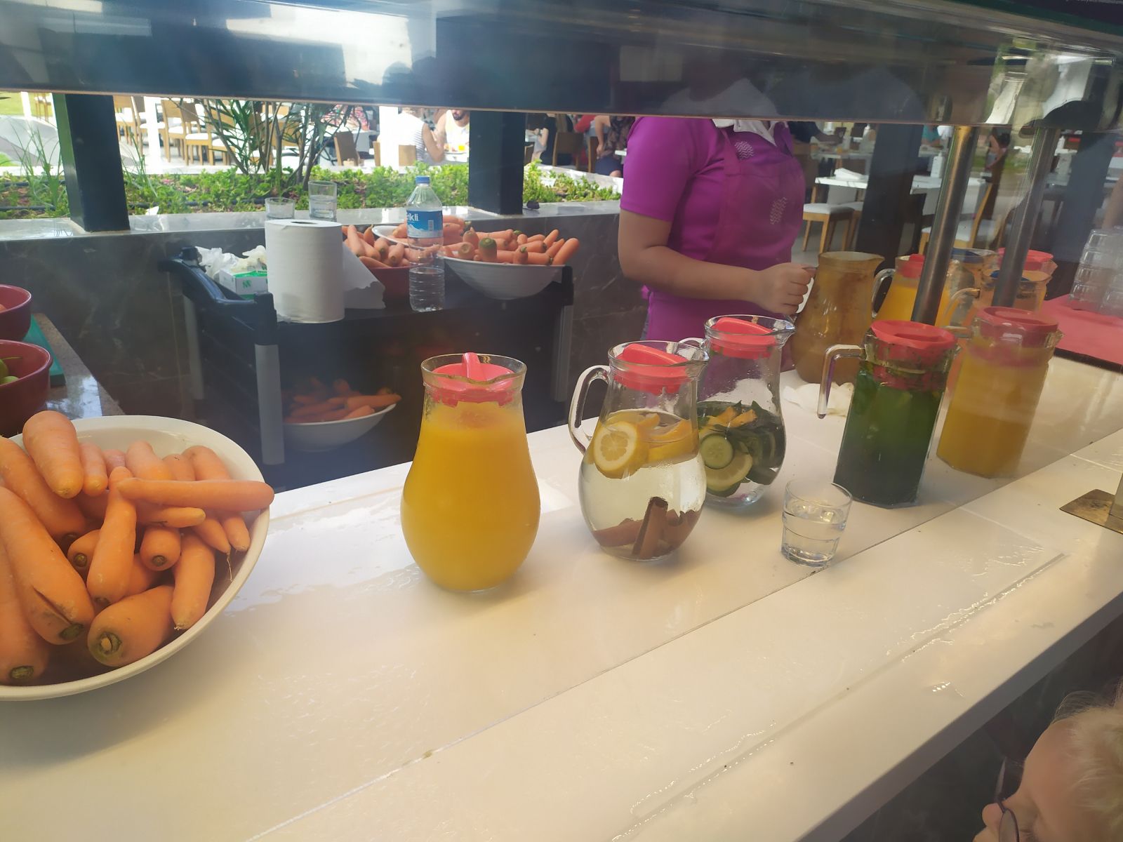 Выбор свежих салатов и сладостей на отдельных витринах тоже не уступает делюкс отелям, а бесплатные свежевыжатые соки, различные детокс-миксы (напомним, отель работает по системе «ультра все включено»), дополняют ощущение премиальности питания.