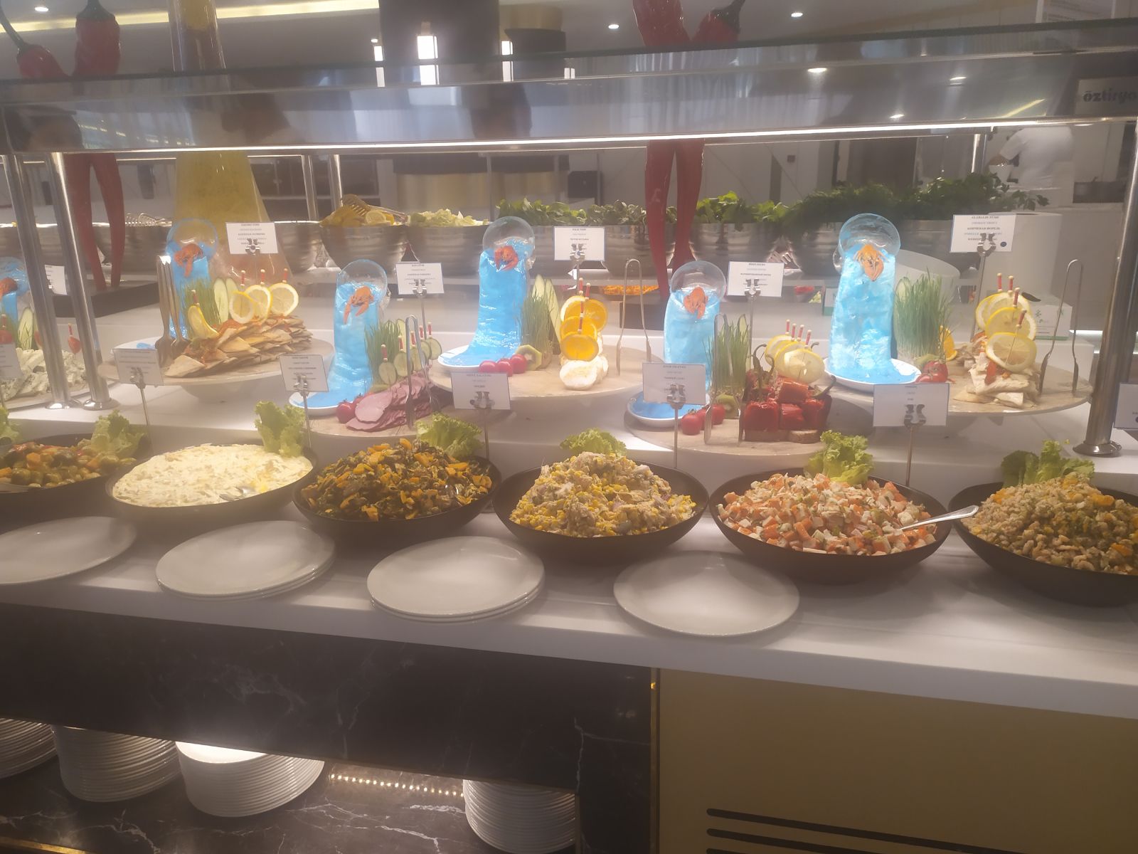 Ассортимент обедов и ужинов широк, преобладает европейская кухня с небольшой примесью турецкой. Всегда есть больше десятка различных мясных блюд (баранина, говядина, индейка, курица) в разных видах и сочетаниях.