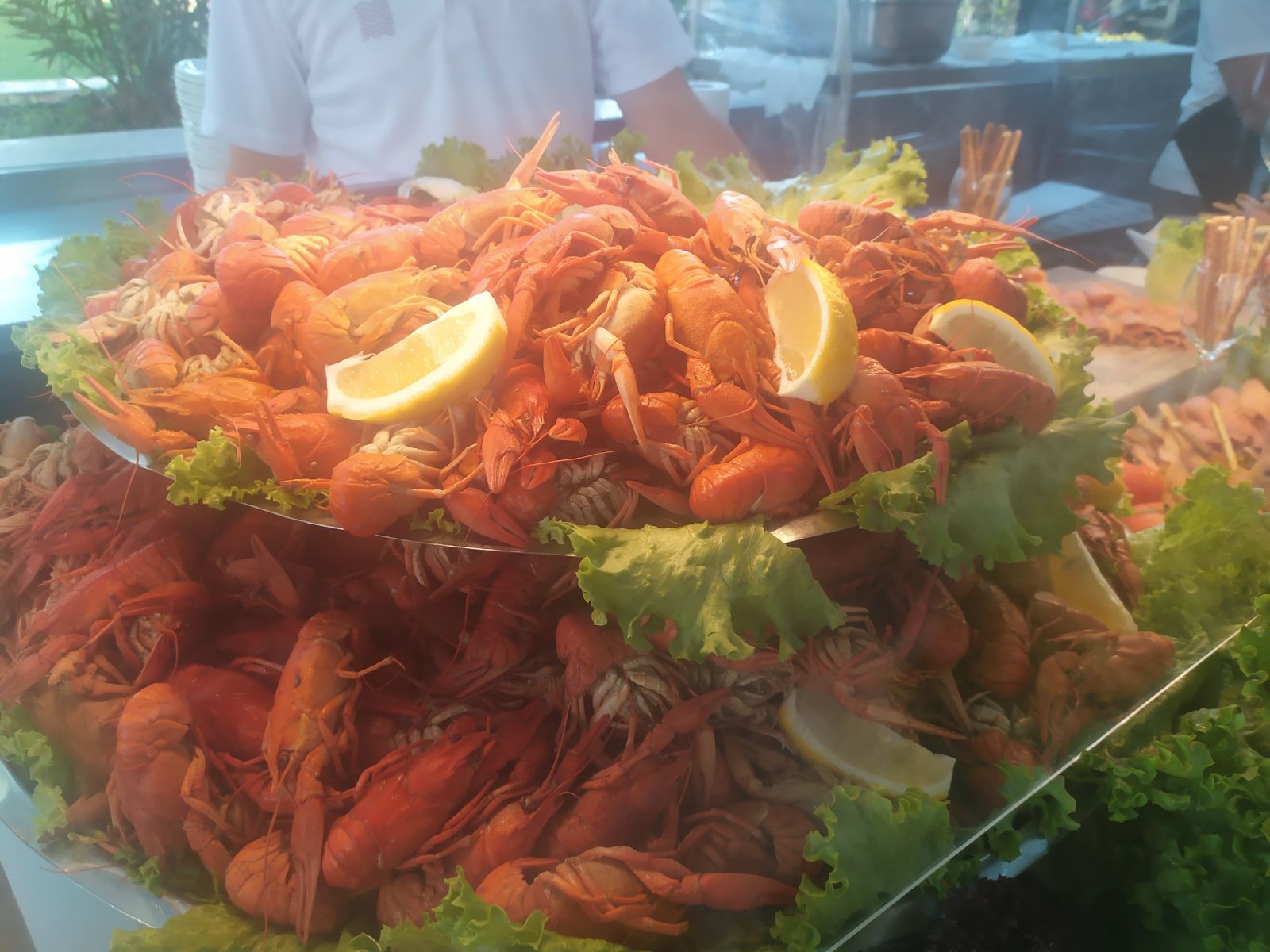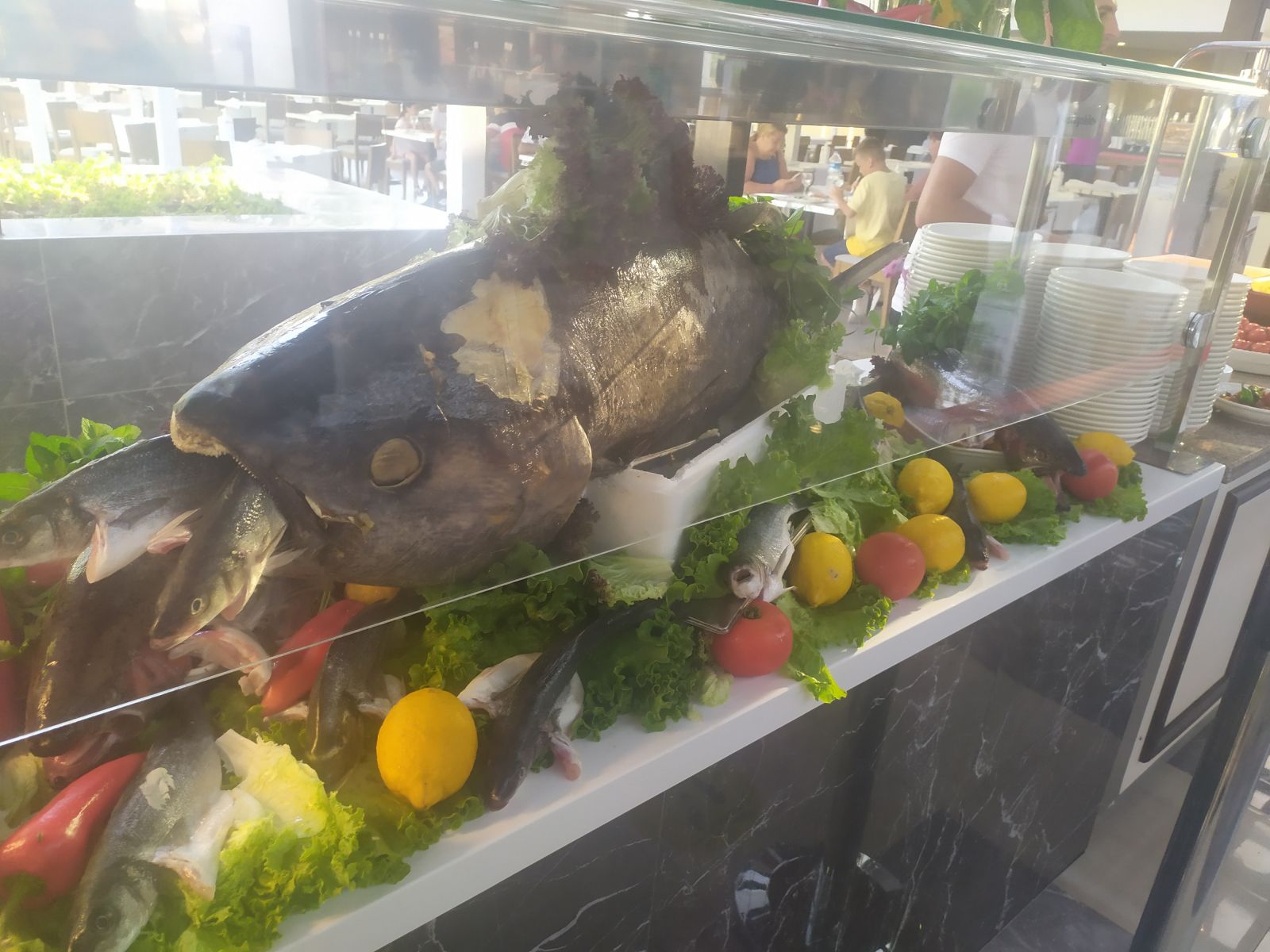 Первое, что встретило нас на ужине в ресторане Seven Seas Hotel Blue 5* – это тематический вечер морепродуктов, которые так ценят многие наши соотечественники, выбирая отели по уровню питания. Хотя мы сами, честно говоря, к ним несколько равнодушны, но здесь был восторг и у детей, и у взрослых. Композиции со свежевыловленными огромными тунцами, мидиями, раками, огромными королевскими креветками сразу вызвали восхищение.