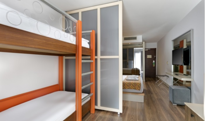 Интересно, что по данным руководства отеля, самый популярный и быстро разбираемый тип номеров – это как раз семейные стандартные номера с двухъярусными кроватями (от родительской зоны они отделены перегородкой). Вероятно потому, что это и правда очень удобно семьям с двумя детьми, а стоят они почти так же, как и обычные стандарты (разница в несколько тысяч рублей за тур).