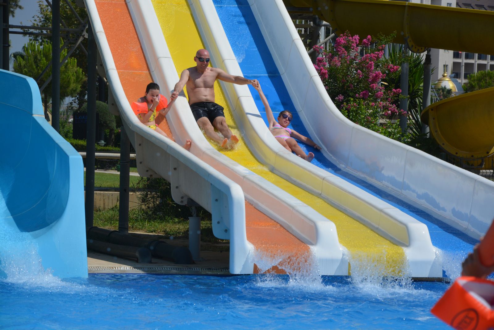 Аквапарк отеля «универсальный» – он с мелким и теплым бассейном, горки несложные и неопасные, так что родители с удовольствием катаются на них даже с маленькими детьми.