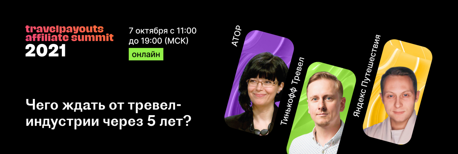 Не пропустите: 7 октября состоится Travelpayouts Affiliate Summit – крупнейшая интернет-конференция о развитии тревел-бизнеса онлайн. Вас ждут доклады и дискуссии с представителями АТОР, Авиасейлс, Яндекс.Путешествия, Travelata, Тинькофф Путешествия, Слетать.ру и другими крупными игроками тревел-рынка.