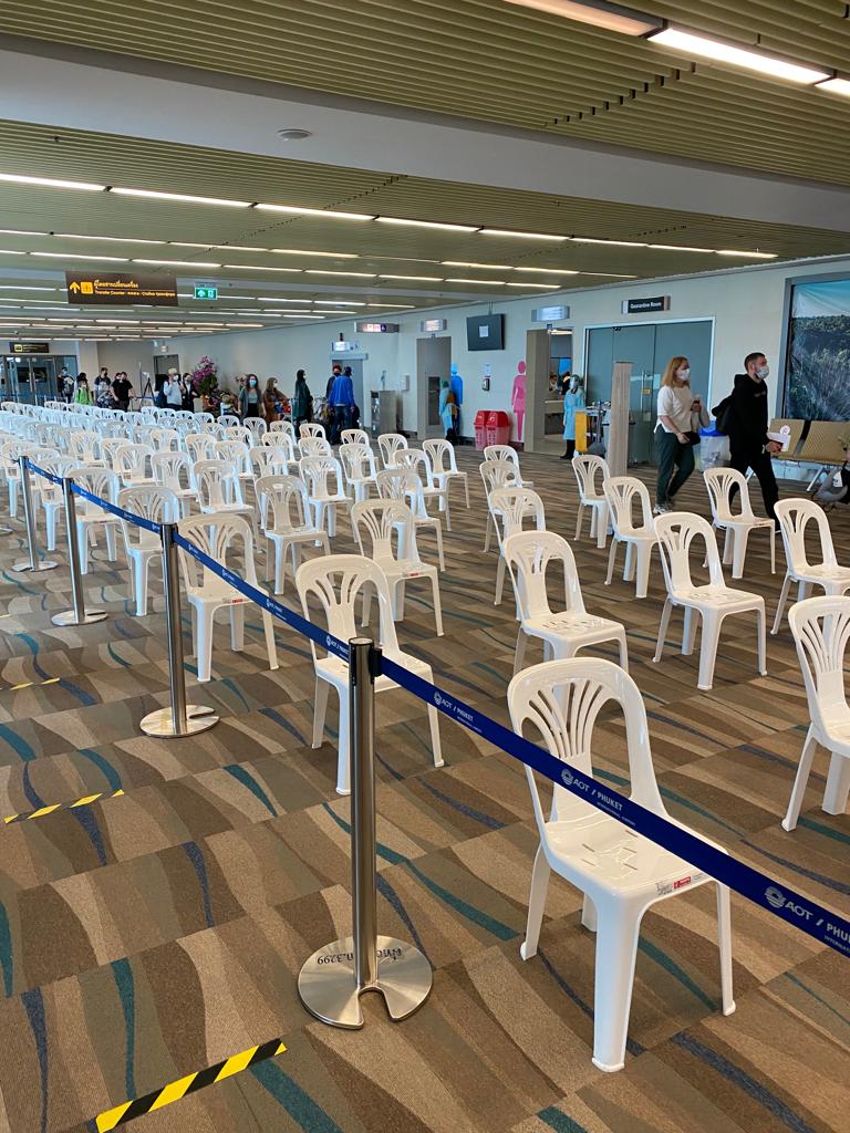 По прилету на Пхукет пассажиров проводят в зал, где расставлены пластиковые стулья, на которых каждый ждет своей очереди для прохождения медицинского контроля.