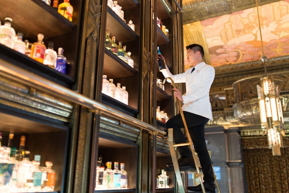 Они окажутся в роскошном элегантном пространстве в стиле ар-деко, удобно расположатся в кожаном кресле и смогут заказать джин из едва ли не лучшей из мировых коллекций этого напитка, насчитывающей более 1300 лейблов. Джину в баре отведено особое место – это позолоченная башня с резными деревянными колоннами и стеклянными полками высотой 8 метров, расположенная за барной стойкой.