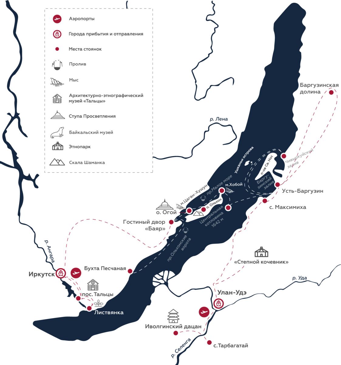 Кроме того, это в полном смысле слова экспедиция. В отличие от традиционных круговых маршрутов, которые часто начинаются и заканчиваются в одной точке, Байкальская экспедиция «Водохода» представляет собой настоящее исследовательское путешествие с Запада на Восток и включает уникальные объекты Иркутской области и республики Бурятия. Стартовать иммерсивные туры будут как в Иркутске, так и в Улан-Удэ.