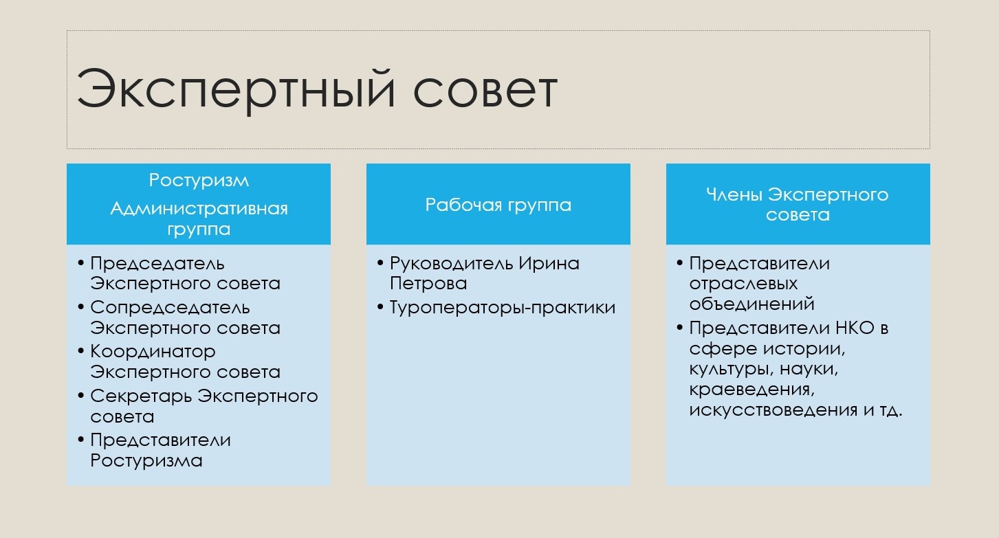 Майя Ломидзе напомнила, что Экспертный совет был создан в 2015 году на базе комитета по импортозамещению при Минкультуры РФ. Она отметила важность поддержки Ростуризма, который увидел в проводимой работе «большие перспективы» и помог выйти на новый уровень.