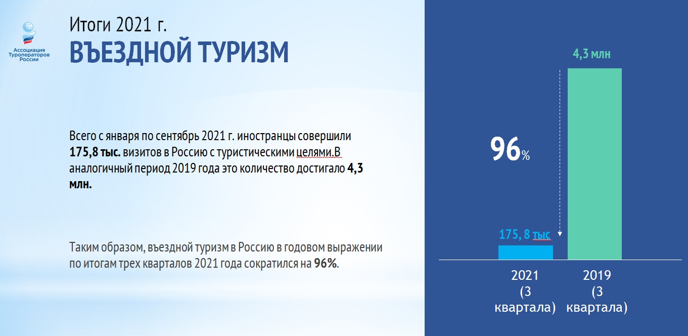 Учитывая, что IV квартал – «несезон» для въездного туризма и его результаты мало что добавят к этим цифрам, можно говорить о том, что по итогам года падение объемов во въездном туризме составило 96% (по сравнению с допандемийным уровнем).