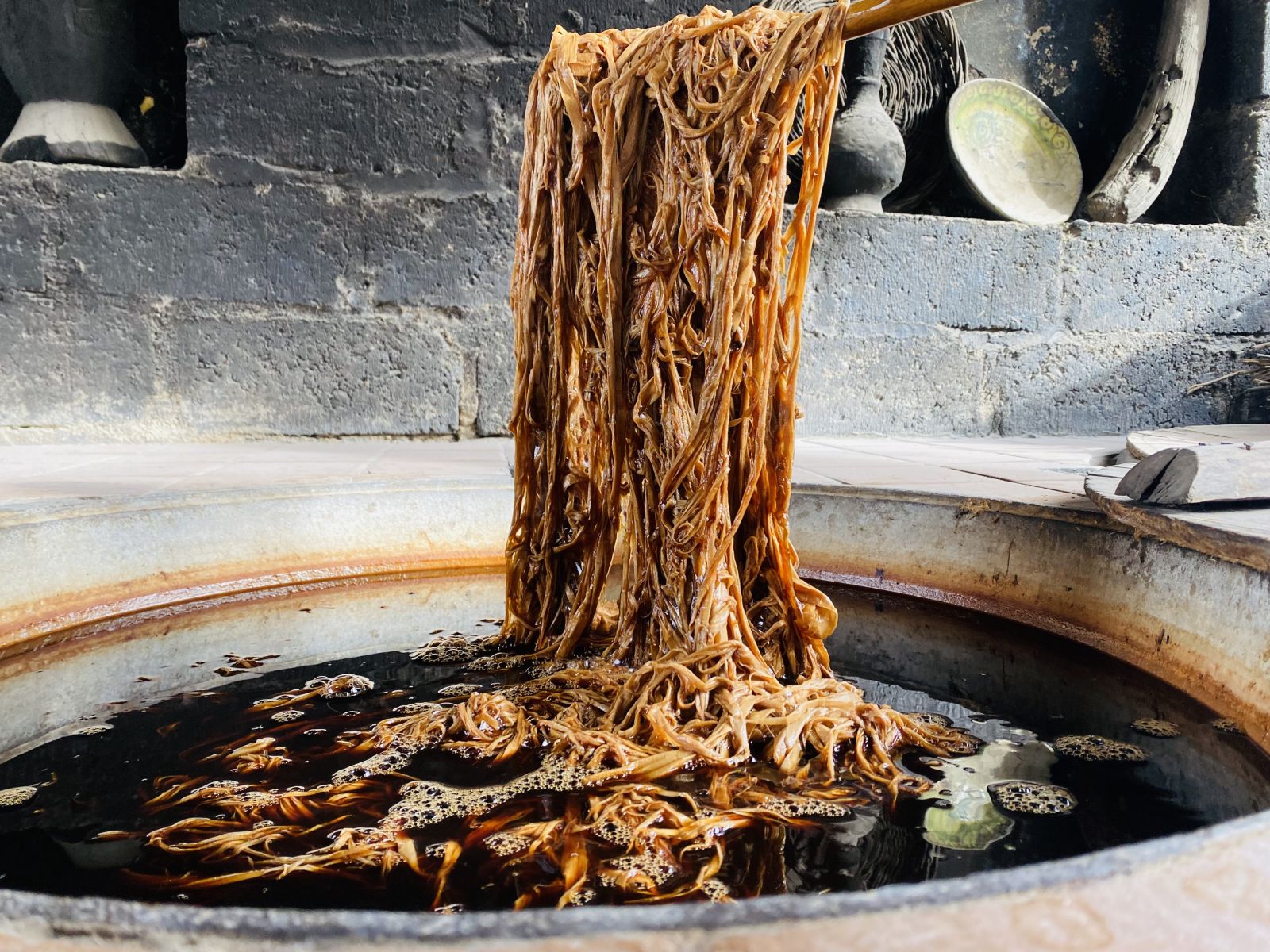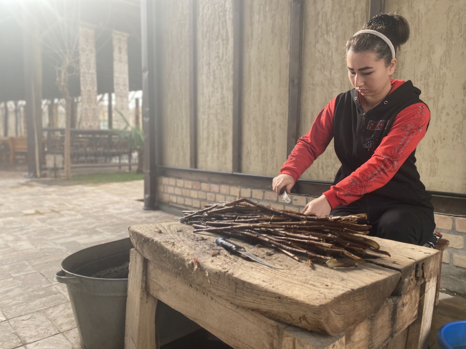 Гости туристической деревни могут понаблюдать за всем процессом. Сначала с веток тутового дерева (того самого, листья которого ест тутовый шелкопряд) снимают кору и удаляют верхний темный слой.