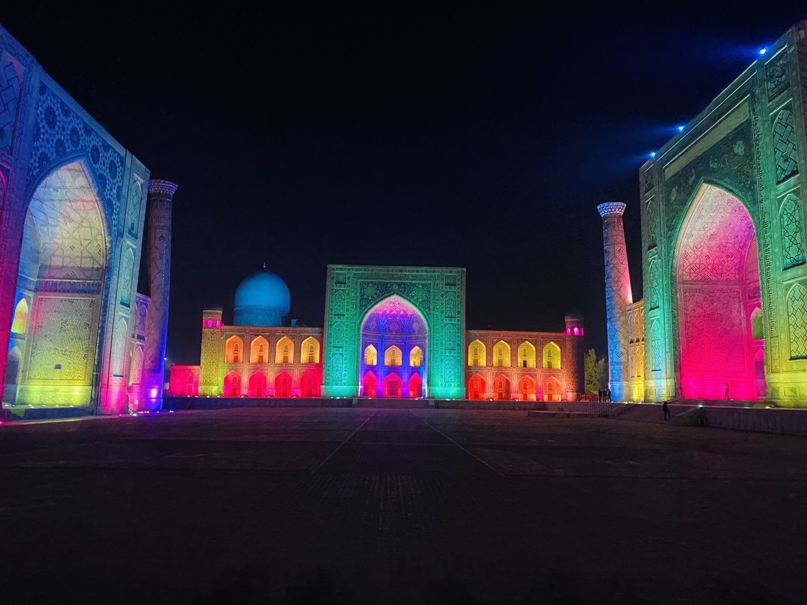 Вечером на площади Регистан меняются виды и ощущения, а когда начинается музыкальное световое шоу, наступает время волшебства. Кажется, поднимешь голову и увидишь, как над площадью бесшумно пролетает ковер-самолет.