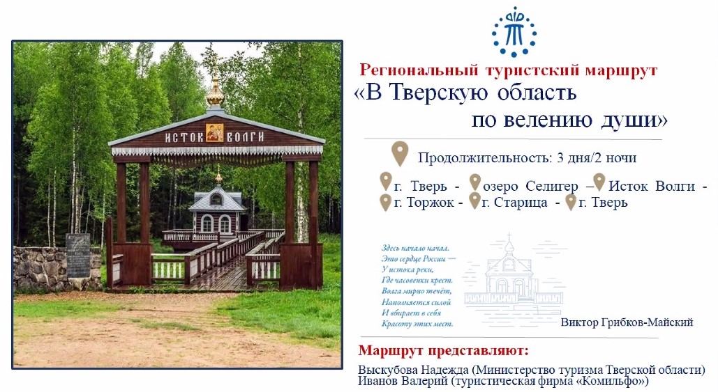 Региональный туристический маршрут «В Тверскую область по велению души» презентовали заместитель министра туризма Тверской области Надежда Выскубова и директор турфирмы «Комильфо» Валерий Иванов. Протяженность маршрута, рассчитанного на 3 дня/2 ночи, составляет более 800 км. Туристы увидят Тверь, Селигер, исток Волги и малые туристические «жемчужины» региона – города Торжок и Старица.