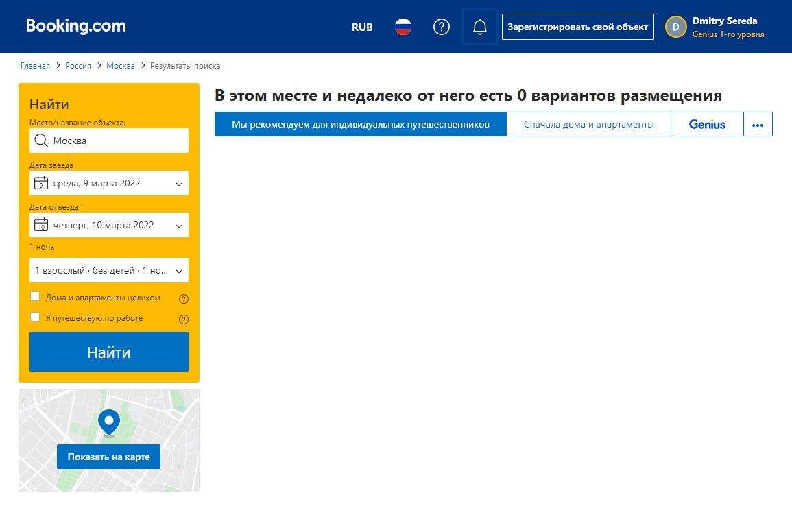 Как заметил корреспондент «Вестника АТОР», русскоязычный сайт глобальной системы онлайн-бронирования Booking.com вечером 4 марта перестал находить варианты размещения в России.