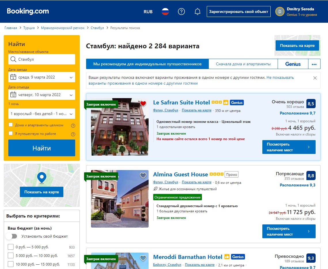 На сайт можно зайти, авторизоваться в личном кабинете, посмотреть историю бронирований и отзывы. По-прежнему можно выбрать и забронировать отель за рубежом.