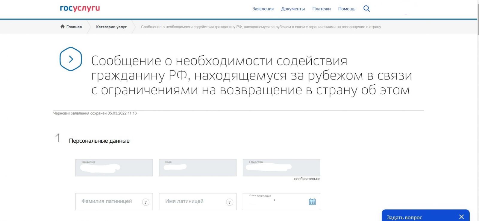Корреспондент «Вестника АТОР» протестировал новую форму для тех, кто «застрял» за границей. Анкета называется «Сообщение о необходимости содействия гражданину РФ, находящемуся за рубежом в связи с ограничениями на возвращение в страну».