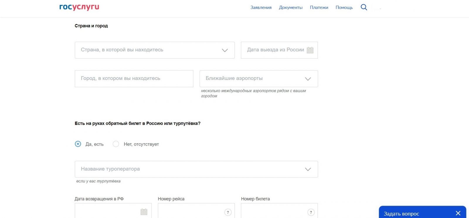 Также туристам надо указать страну и город, в котором они находятся и обозначить несколько международных аэропортов рядом с этим городом, а также дату выезда из России.