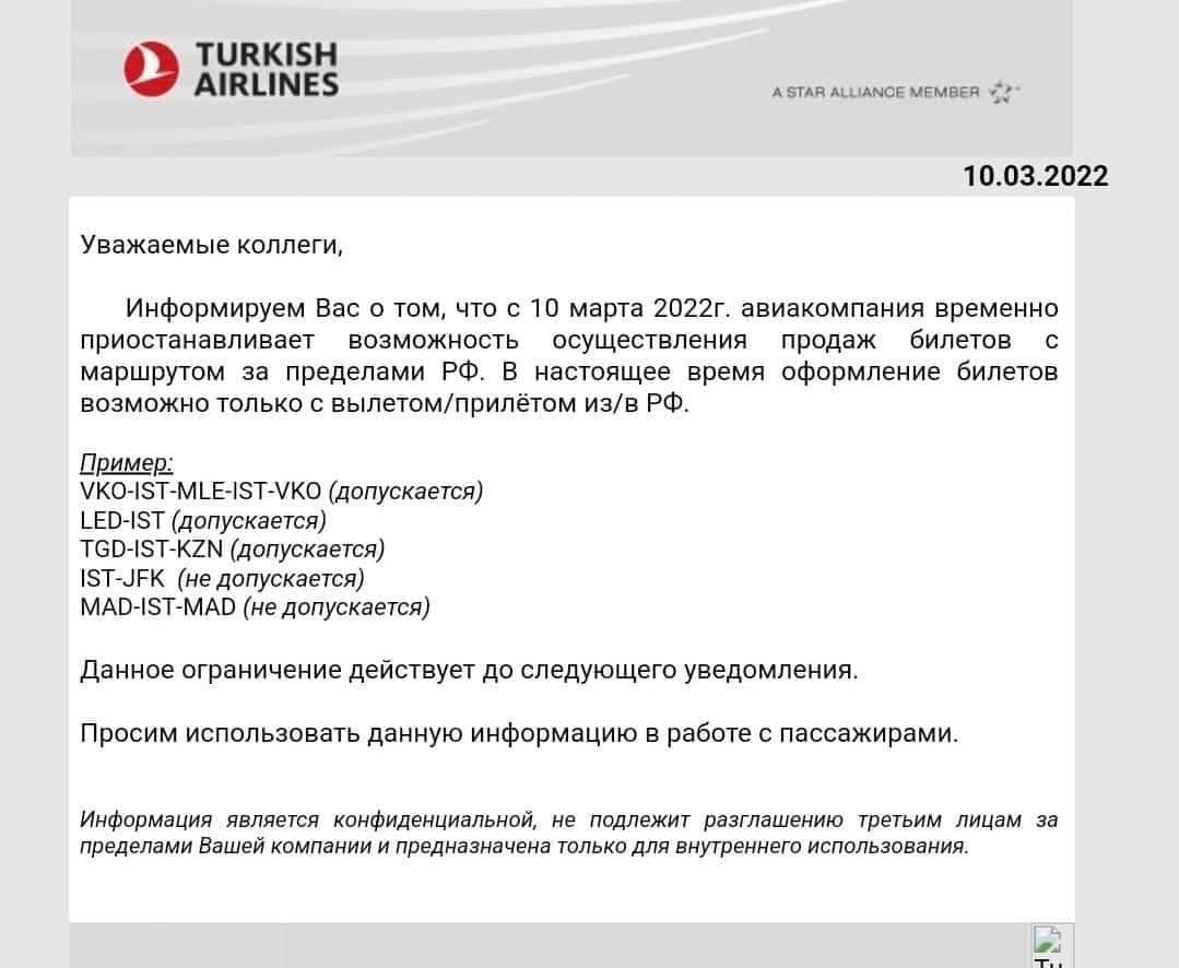 «Информируем вас о том, что с 10 марта 2022 года авиакомпания Turkish Airlines временно приостанавливает возможность осуществления продаж билетов с маршрутами за пределами РФ. В настоящее время оформление билетов возможно только с вылетом/прилетом из/в РФ», – говорится в сообщении Turkish Airlines для билетных агентов.