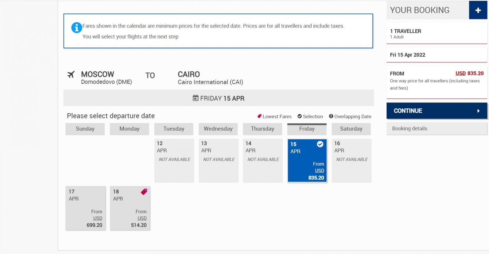 Билет в одну сторону с вылетом 15 апреля стоит от 835 долларов (от 66,5 тыс. р. по курсу ЦБ) на одного пассажира в одну сторону. Билет в Каир с вылетом 30 апреля обойдется в такую же сумму.