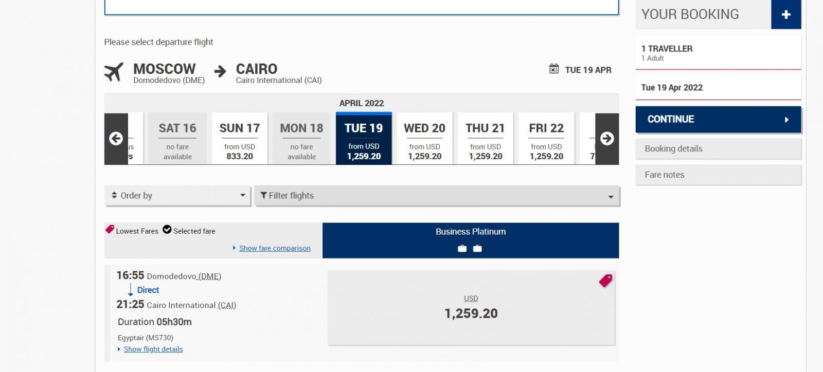 Как следует из системы бронирования Egypt Air, на рейс с отправлением 17 апреля можно купить билет от 833 долларов (66 700 р. по курсу ЦБ РФ), а вот перелет на следующей неделе обойдется значительно дороже: от 1259 долларов (почти 111 тыс. р.) в одну сторону на одного пассажира, поскольку в продаже остались места только в бизнес-классе.