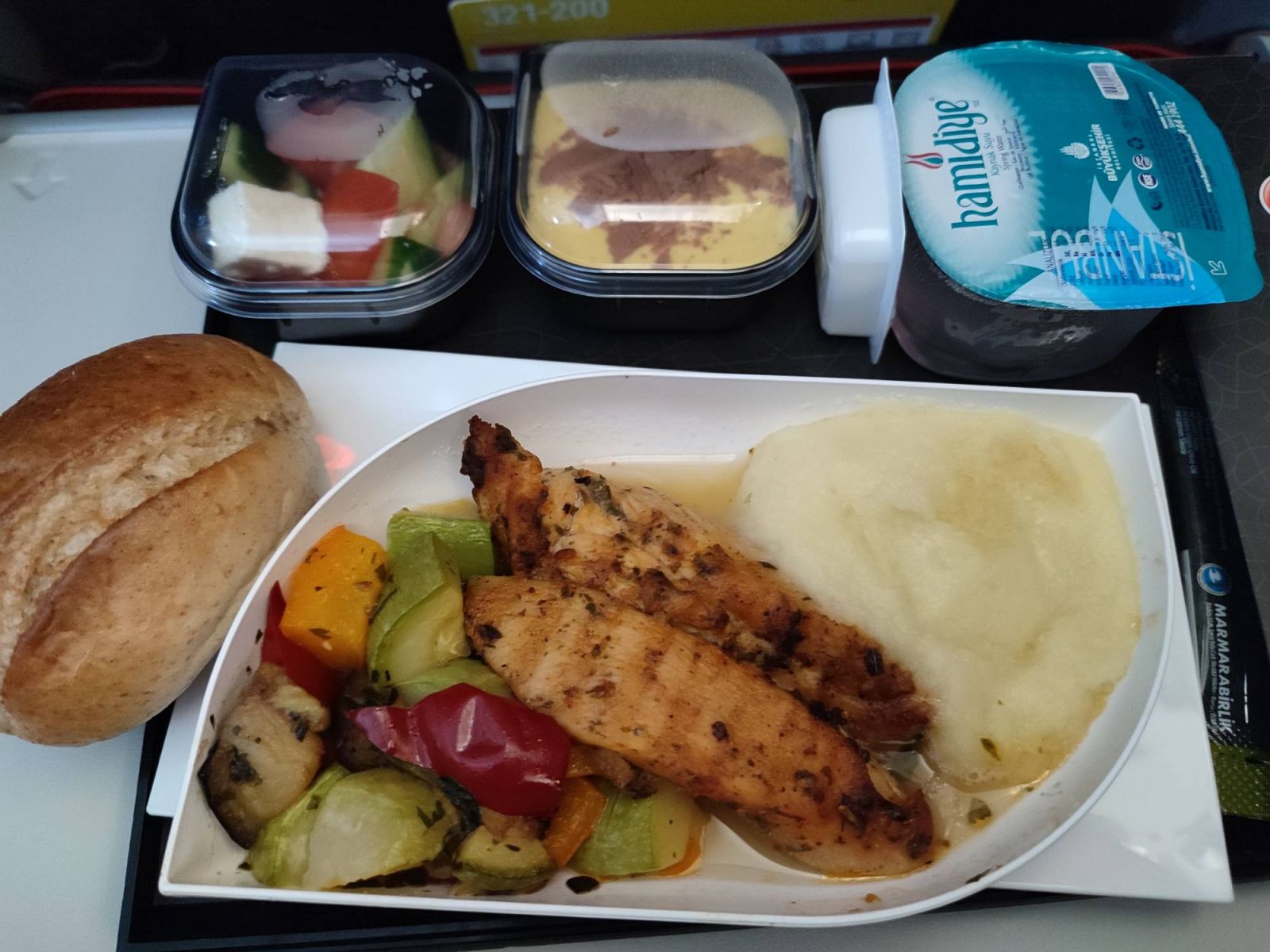 Питание – вовсе не сэндвич с водой, как ожидалось. А полноценный фирменный горячий обед Turkish Airlines со свежим горячим хлебом, салатом с турецкой брынзой, нежным десертом.