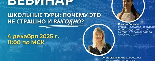 Собрали для вас 25-летний опыт работы со школьными группами, рабочие стратегии продвижения и самые свежие предложения для юных путешественников. 4 декабря в 11:00 приглашаем на онлайн-вебинар, на котором Ксения Боровик и Ольга Железкина, специалисты отдела приёма туристов в Санкт-Петербурге, расскажут как легко продавать школьные туры в Петербург!