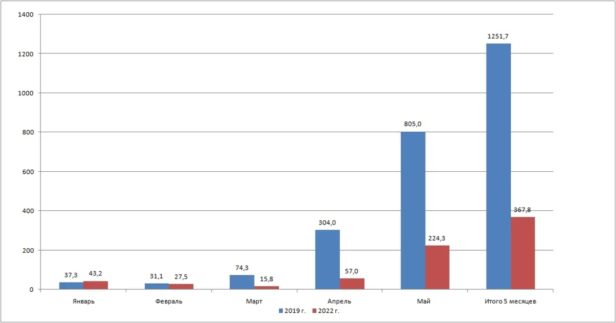 Рис. 1. Динамика российских прибытий в Анталью, январь – май, 2019 и 2022 г.