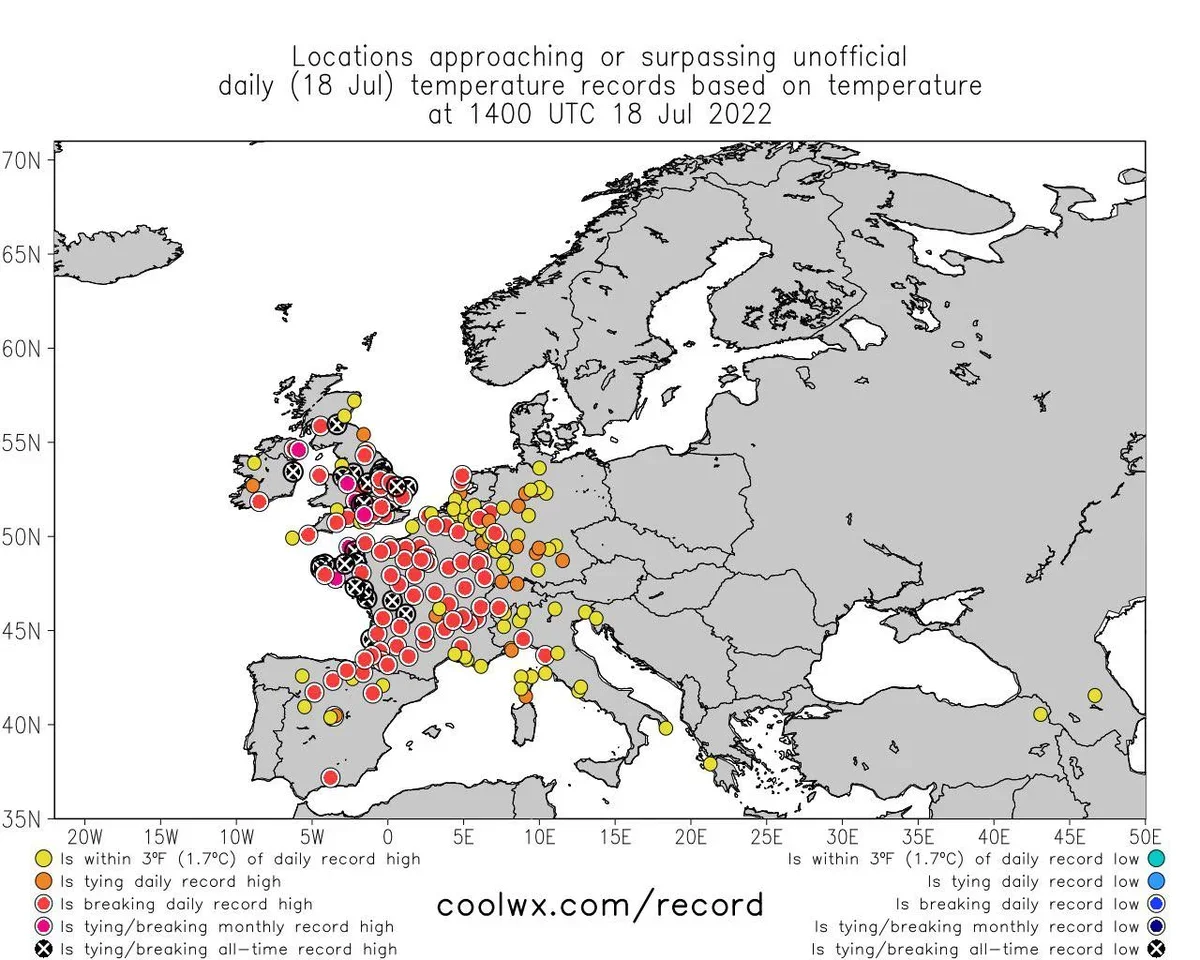 Температурные рекорды (до 40°C) обновили даже в Британии: 18 июля оказалось самым жарким днем за всю историю наблюдений. Из-за высоких температур скорость в лондонском метро ограничили. Национальная железнодорожная сеть также призвала пассажиров оставаться дома и заявила, что некоторые услуги, в том числе ключевой маршрут между северо-востоком Англии и Лондоном, не будут работать во вторник.