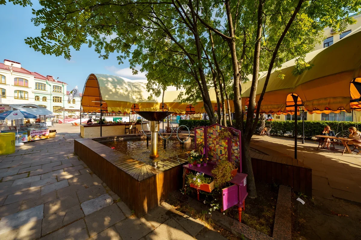 Кроме живых выступлений, можно посетить милый садик с персонажами из аниме Миядзаки и отдохнуть в шатре с мягкими диванами. В зимнее время площадка будет закрыта.