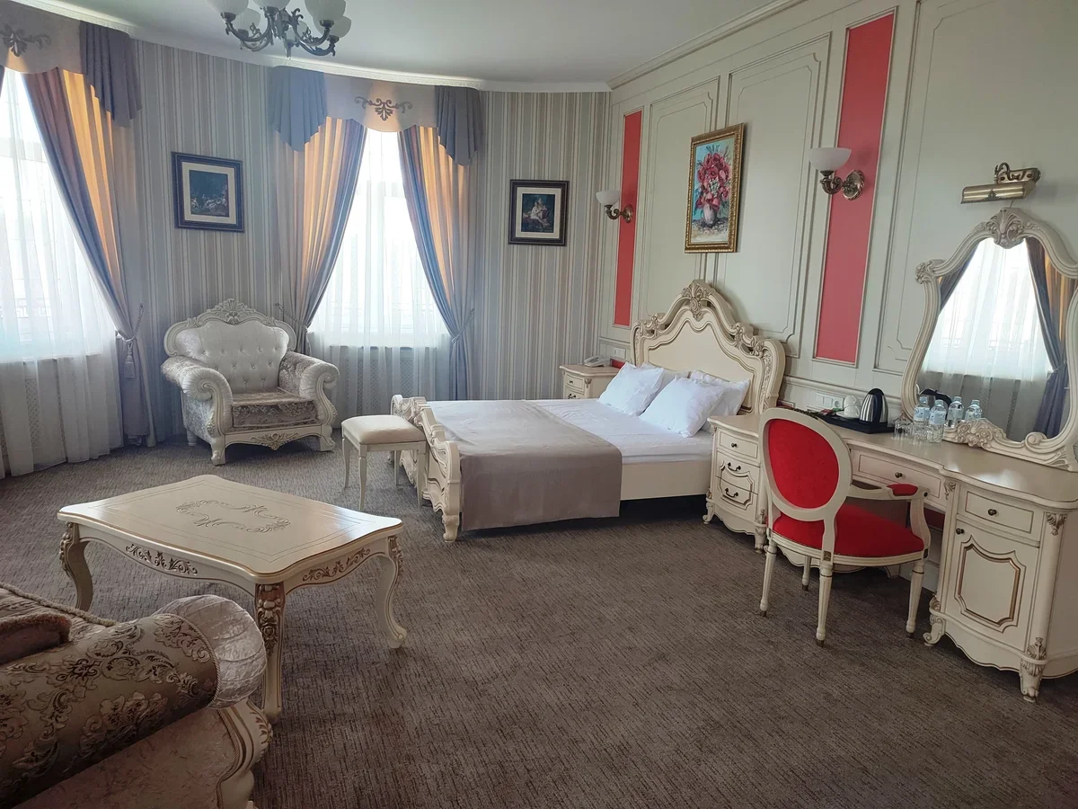 Максимально этот стиль проявляется в корпусе «Империал»: двух- и трехкомнатные номера люкс с лоджиями, видовой ресторан на крыше с камином, мебель из массива дерева, атлас, искусственный шелк, бархат, гобелены, картины, позолота, бронза и пр.