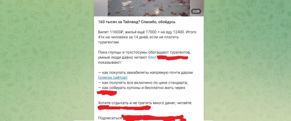 Так, один из телеграм-каналов, чья агрессивная платная реклама замечена на минувших выходных во многих известных пабликах, предлагает своим подписчикам, желающим поехать в Таиланд, отказаться от услуг «жадных турагентов».