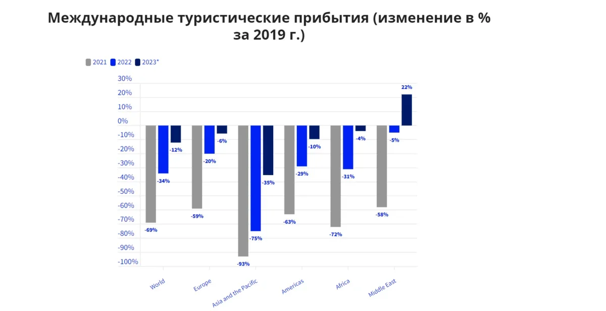 В лидерах восстановления международного туризма – Ближний Восток, Европа и Африка. В 2023 году Ближний Восток стал единственным макрорегионом в мире, в котором количество международных прибытий превысило допандемийный уровень (+22% к 2019 году).