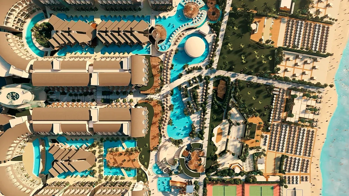 - в отеле 10 бассейнов, из них – 5 открытых бассейнов для взрослых, 3 открытых детских, и 2 крытых – детский и взрослый. Крытые бассейны подогреваемые. По открытым бассейнам пока точной информации нет.