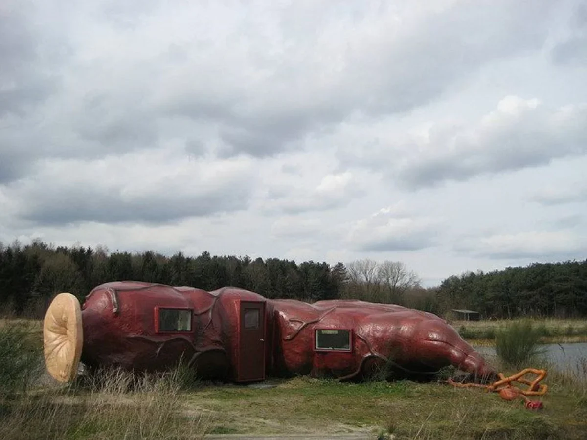 Недалеко от Антверпена, в городке Стекене, есть ну очень причудливый отель. Его архитектура и дизайн в точности копируют толстую кишку человека. Затейливое сооружение, повторяющее форму толстой кишки, изначально было создано голландским дизайнером Юпом ванн Лисхаутом в качестве арт-объекта. Теперь оно является частью парка искусств Verbeke Foundation, где представлены произведения современных художников Западной Европы. Внутри все очень просто: отопление, двуспальная кровать и душ.