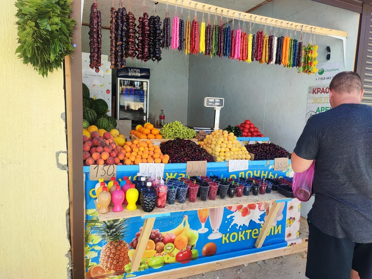 Мороженое – от стаканчиков из «Магнита» за 80 руб. до киосков «Тайского мороженого» за 350 рублей порция. Кофе в городе– 200-250 руб, квас – 30-60 рублей стаканчик (0,3 или 0,5 л). Пиво – от бюджетного разливного до крафтового за 400-500 рублей кружка и выше. Вино, коньяк – дорого (курорт). Персики стоят 250 руб. за килограмм, абрикосы – 200 рублей, черешня – от 220 до 400 руб. за кило.