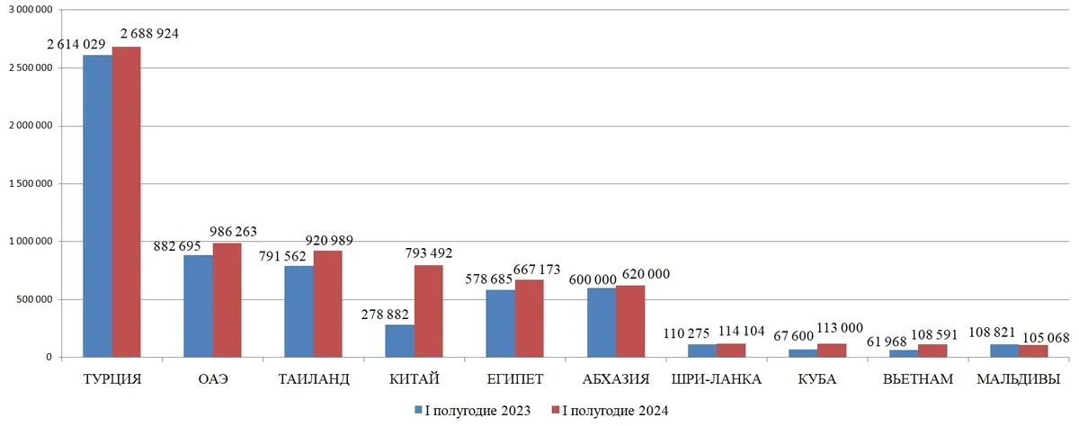 ТОП-10 СТРАН, КОТОРЫЕ ПОСЕЩАЛИ РОССИЙСКИЕ ТУРИСТЫ В I ПОЛУГОДИИ 2024 ГОДА