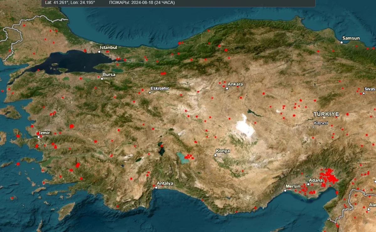 Спутниковая карта пожаров НАСА показывает обстановку на основных курортах Эгейского побережья: