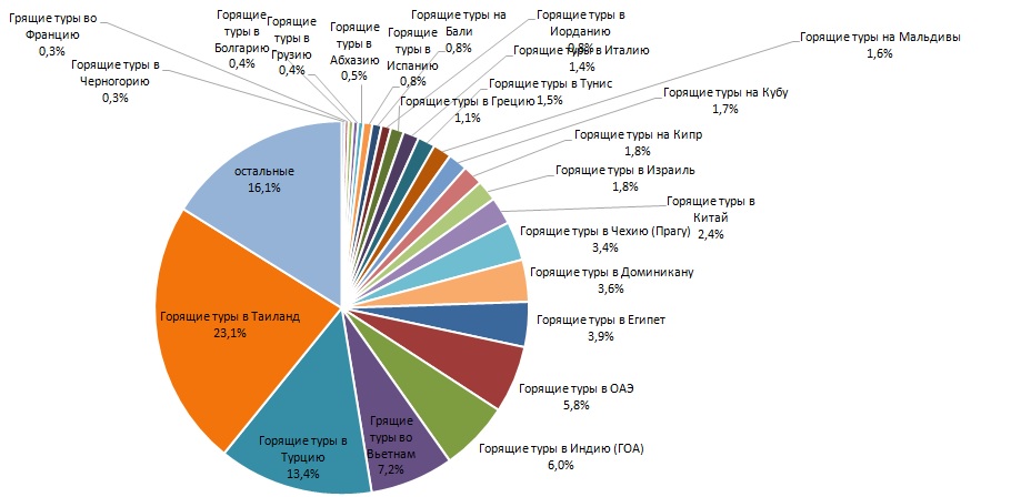 Наибольшее число пользователей (23,1%) искавших горящие туры по зарубежным направлениям интересовались отдыхом в Таиланде. Поиск путевок по сниженной цене в Турцию в поисковой системе осуществляло 13,4% россиян, искавших туры на ближайшие даты вылета за рубеж. Третьим по популярности был Вьетнам (7,2%), далее следует Индия (6%) и ОАЭ (5,8%).
