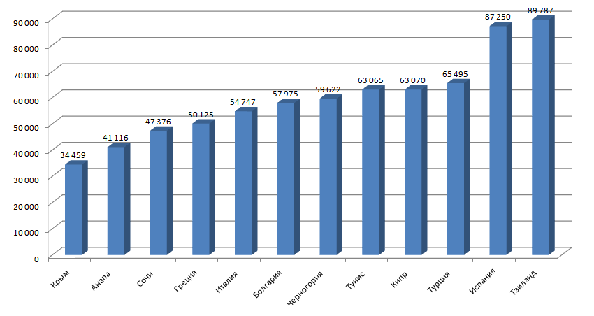 Рис. 1. Средняя цена пакетных туров на пляжные туры в конце мая (вылет 26.05 из Москвы, на семь ночей, на двоих, рублей)