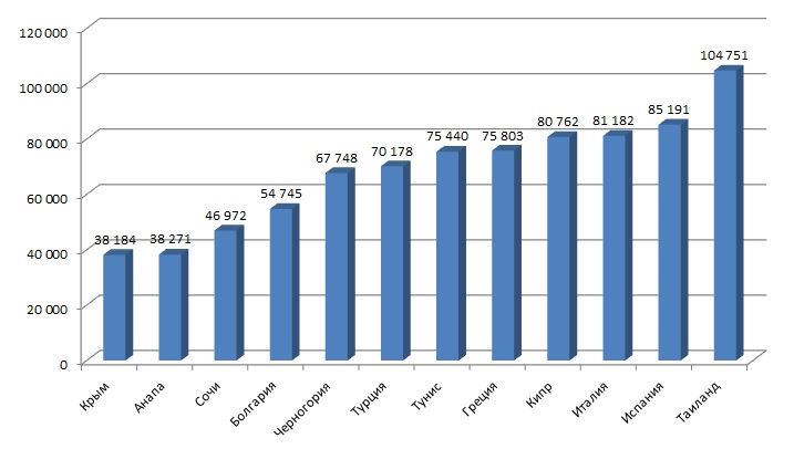 Рис. 1. Средняя цена пакетных туров на пляжные направления в конце июля (вылет 20.07 из Москвы, на семь ночей, на двоих, рублей)