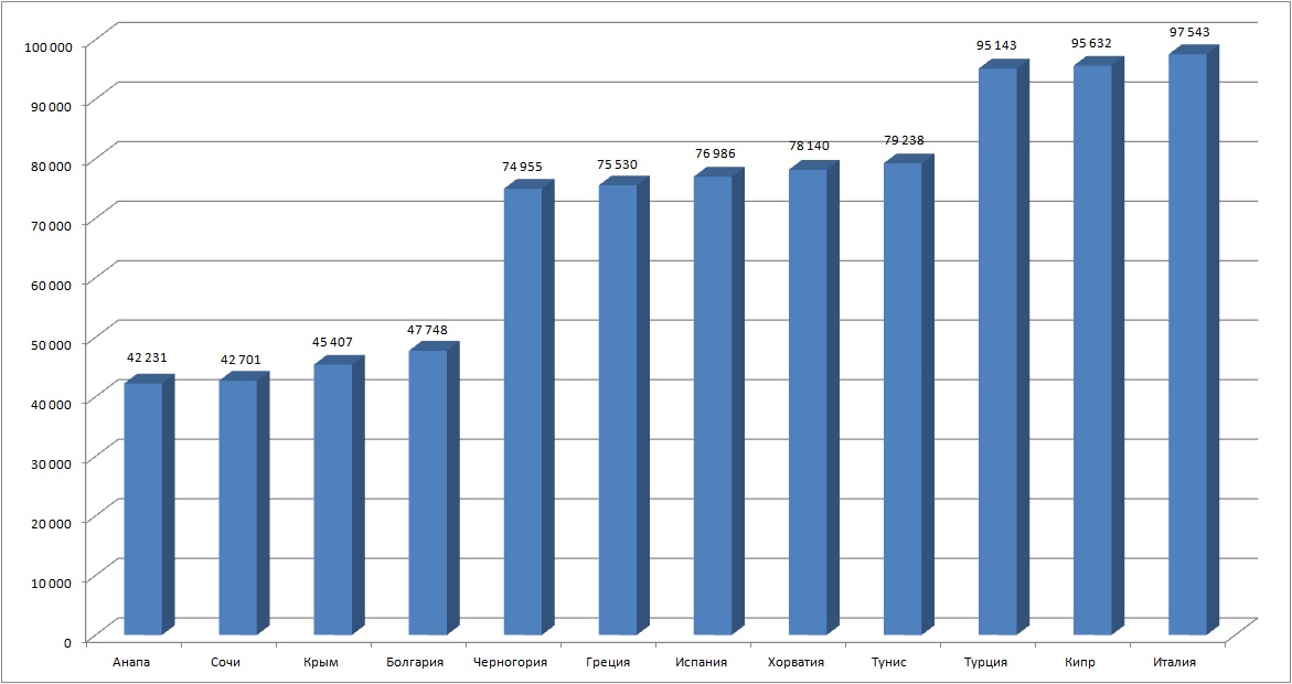 Первая группа (40-50 тыс. р. за 10-дневный тур на двоих с перелетом): Анапа, Сочи, Крым, Болгария.
