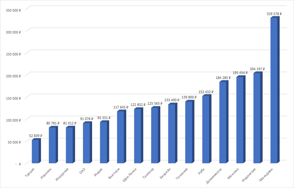 - категория «до 100 тыс. р. на двоих» уменьшилась только за счет Китая (куда больше не продаются туры): в ней остались Турция, Израиль, Иордания, ОАЭ и Индия.