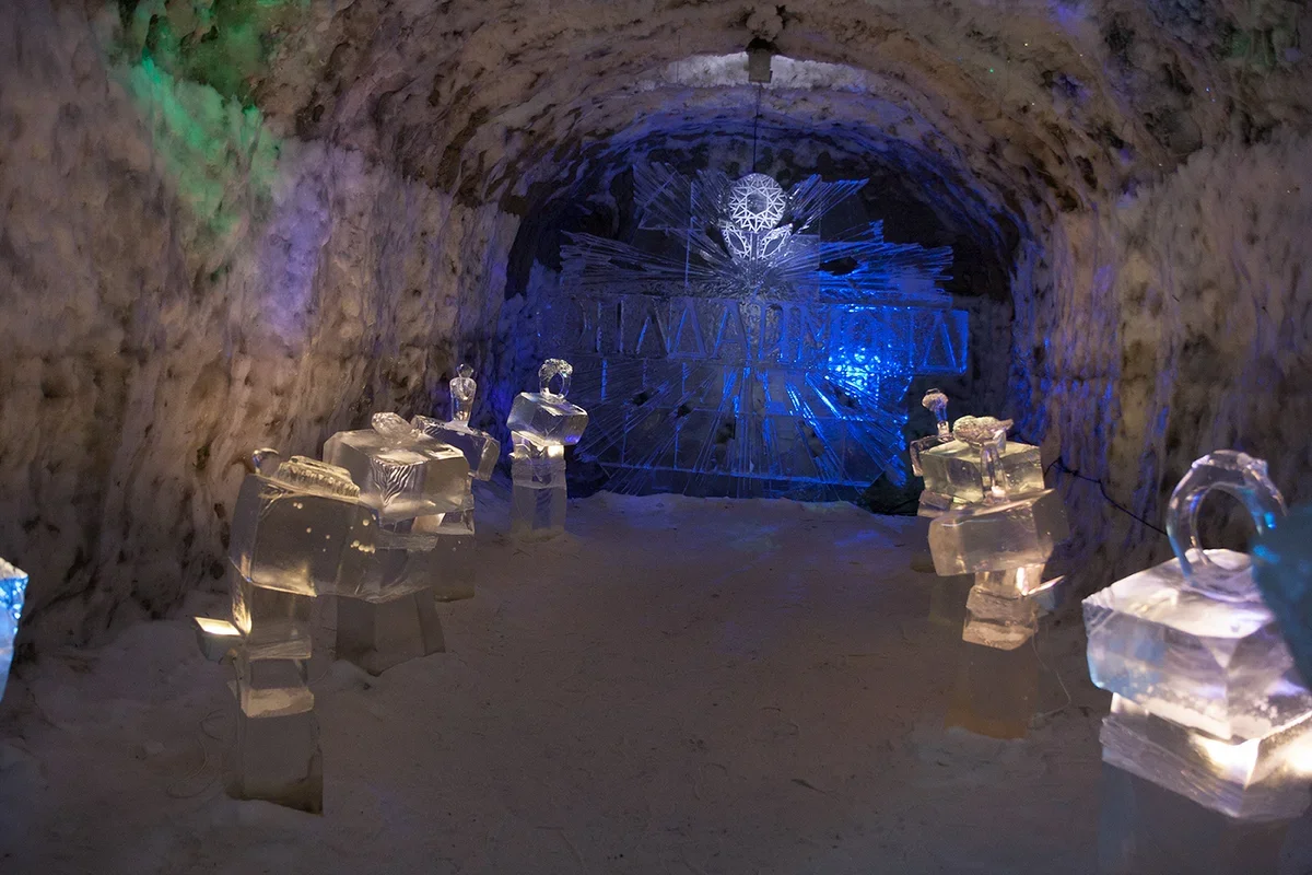 Оно представляет из себя лабиринт ледяных пещер внутри сопки, где в любое время года держится минусовая температура. Пещеры украшены красивыми ледяными фигурами, выполненные местными мастерами: даже летом здесь можно почувствовать себя в гостях у Деда Мороза или Снежной Королевы – кому что по душе.