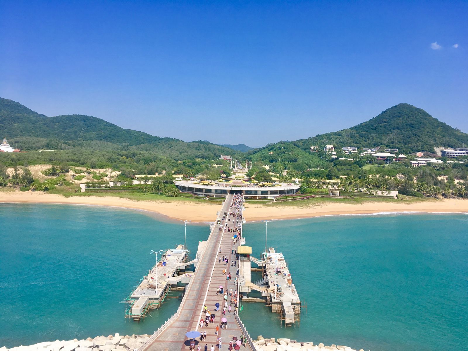 Прогуляться по мосту нужно обязательно – оттуда открывается бесподобный вид на бухту Хайтанг Бэй и гору Учжишань («Гора пяти пальцев»).